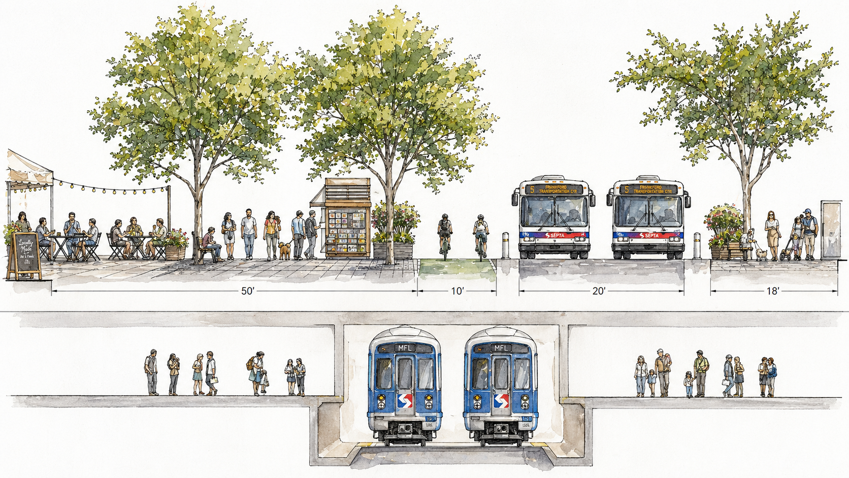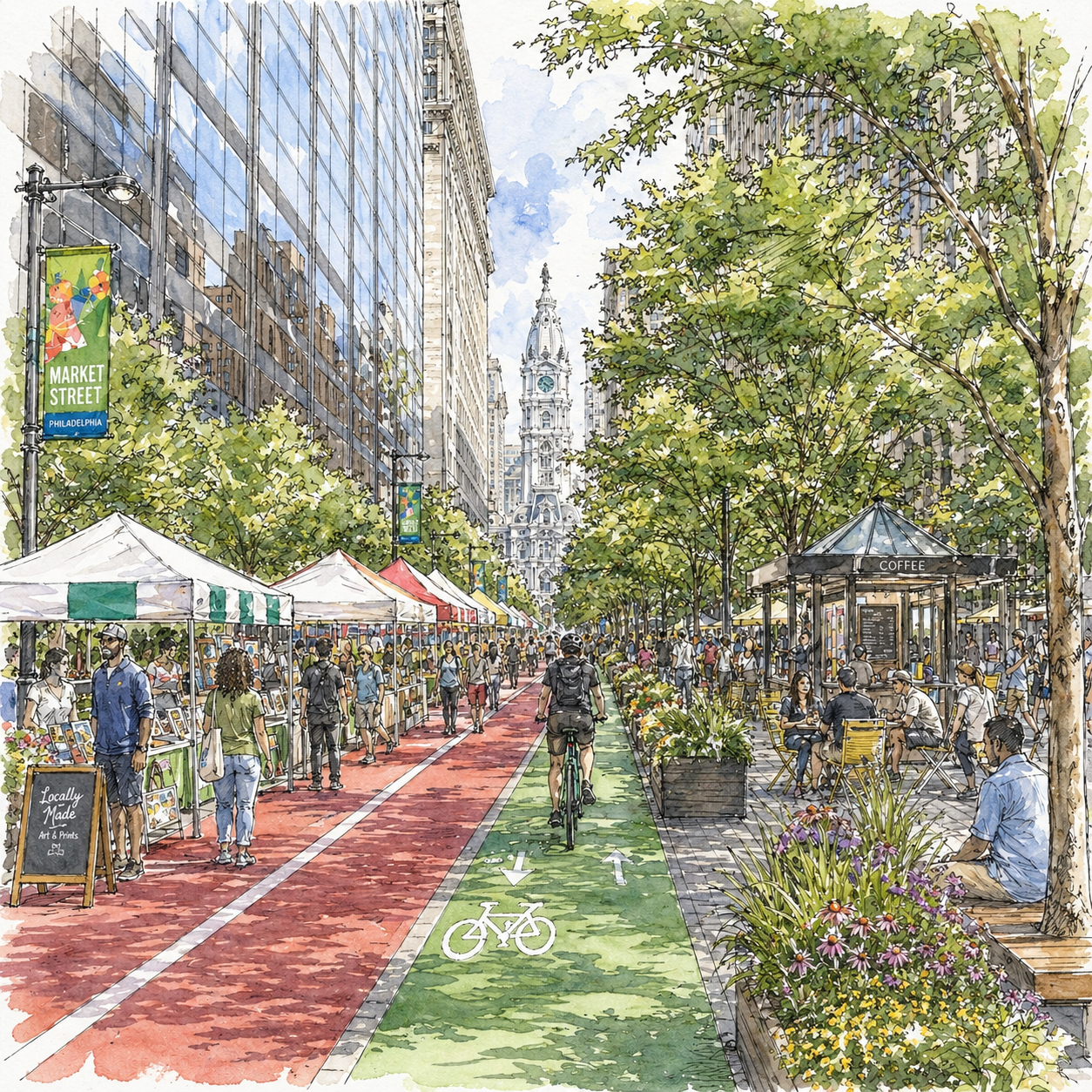 Our goal is not simply to beautify the corridor. It is to create a people-first public realm that is greener, safer, and more usable every day. By reclaiming space for pedestrians, improving transit and bicycle infrastructure, strengthening ecological performance, and creating a more welcoming and coherent streetscape, Market East can become a stronger connector between institutions, neighborhoods, and public destinations.